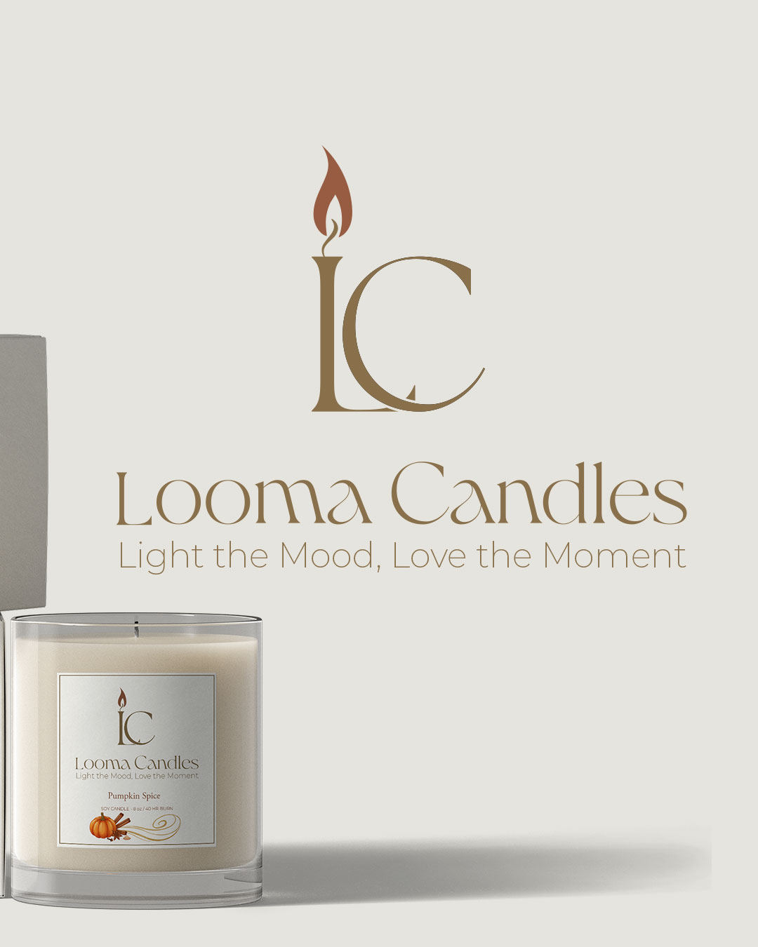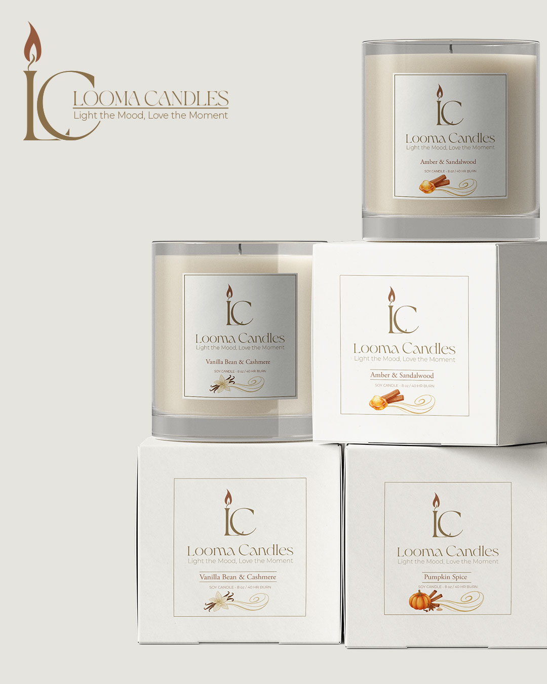 Brand identity system developed for a lifestyle candle brand, including logo design, color palette, packaging concepts, and social media visuals.